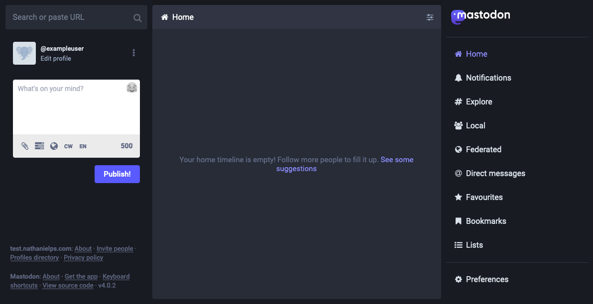 Following the example application installed above, an icon for Mastodon should now be visible. Selecting this opens the Mastodon instance and automatically logs in as the current YunoHost user (e.g. exampleuser).
